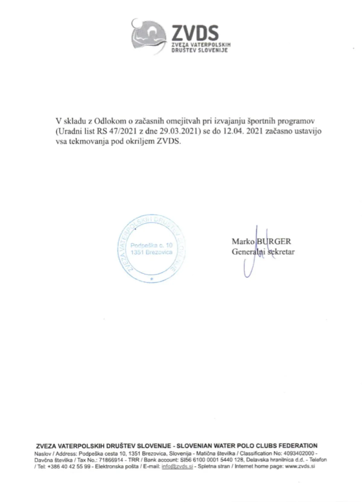 V času zaprtja države med 1. 4. in 12. 4. 2021 so odpovedana vsa tekmovanja pod okriljem ZVDS. O novem koledarju tekem vas bomo obvestili, ko bodo razmere dopuščale nadaljnjo izvedbo tekmovanj.